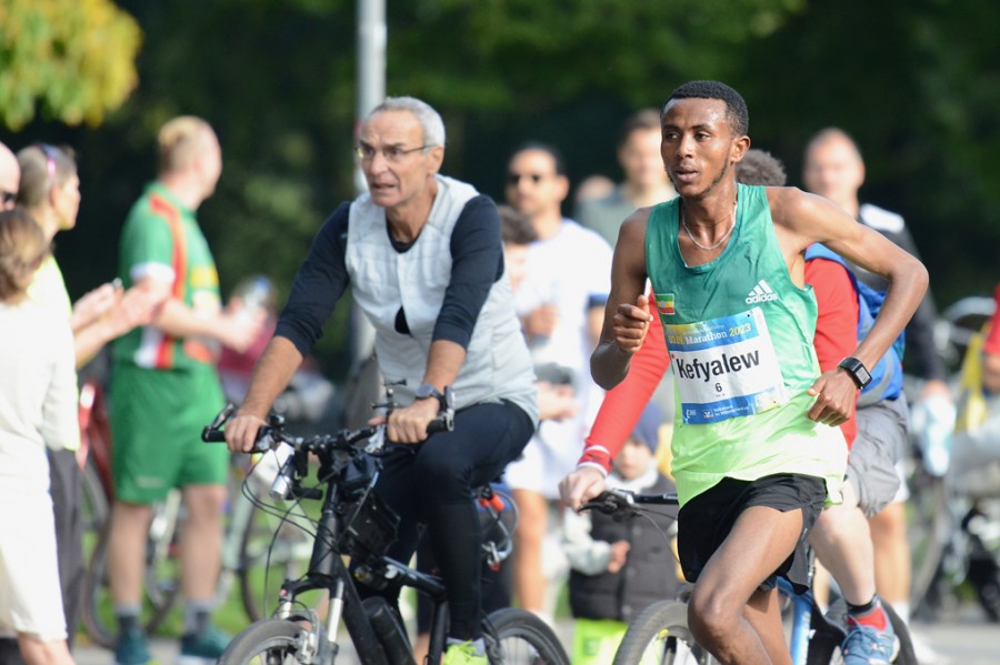 Der Edelhase, in diesem Fall Hendrik Pfeiffer höchstpersönlich, legte sich mächtig ins Zeug. Er spielte die Rolle des "Pacemakers" für die Topleute aus Ostafrika, die entschlossen waren, die fünf Jahre alte Höchstmarke (2:09:28 Stunden) von Justus Kiprotich anzugreifen. Schon vor dem Start schien er ein wenig nervös zu sein. "Das ist eine äußerst verantwortungsvolle Aufgabe", sagte der deutsche Marathonmeister, "wir haben die Zwischenzeiten im Voraus abgestimmt." Wie ein gut geöltes Uhrwerk führte er die Läufer in den ersten fünf Kilometern in 15:25 Minuten an, passierte die Zehn-Kilometer-Marke in 30:39 Minuten und die 15-Kilometer-Marke in 45:48 Minuten.