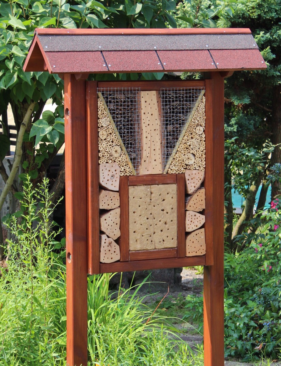 Immer öfter findet man in Klein-, Schul-, Landschaftsgärten, Parks, an Feld- und an Waldrändern Insektenhotels. In den letzten Jahren erfreuen diese sich immer größerer Beliebtheit. Insektenhotels gibt es in verschiednen Größen und Formen, zum Aufstellen, hängend an Wänden oder Bäumen oder einfach irgendwo befestigt. Welche Aufgabe haben nun diese in verschiedenen Formen Selbstgebauten oder gekauften Insektenhotels? Durch die chemische Schädlingsbekämpfung, und den Anbau von Monokulturen, gibt es immer weniger artgerechte Lebensräume für die Insekten. Zum einen dienen sie den Insekten als Nistplatz und als Platz zum Überwintern.